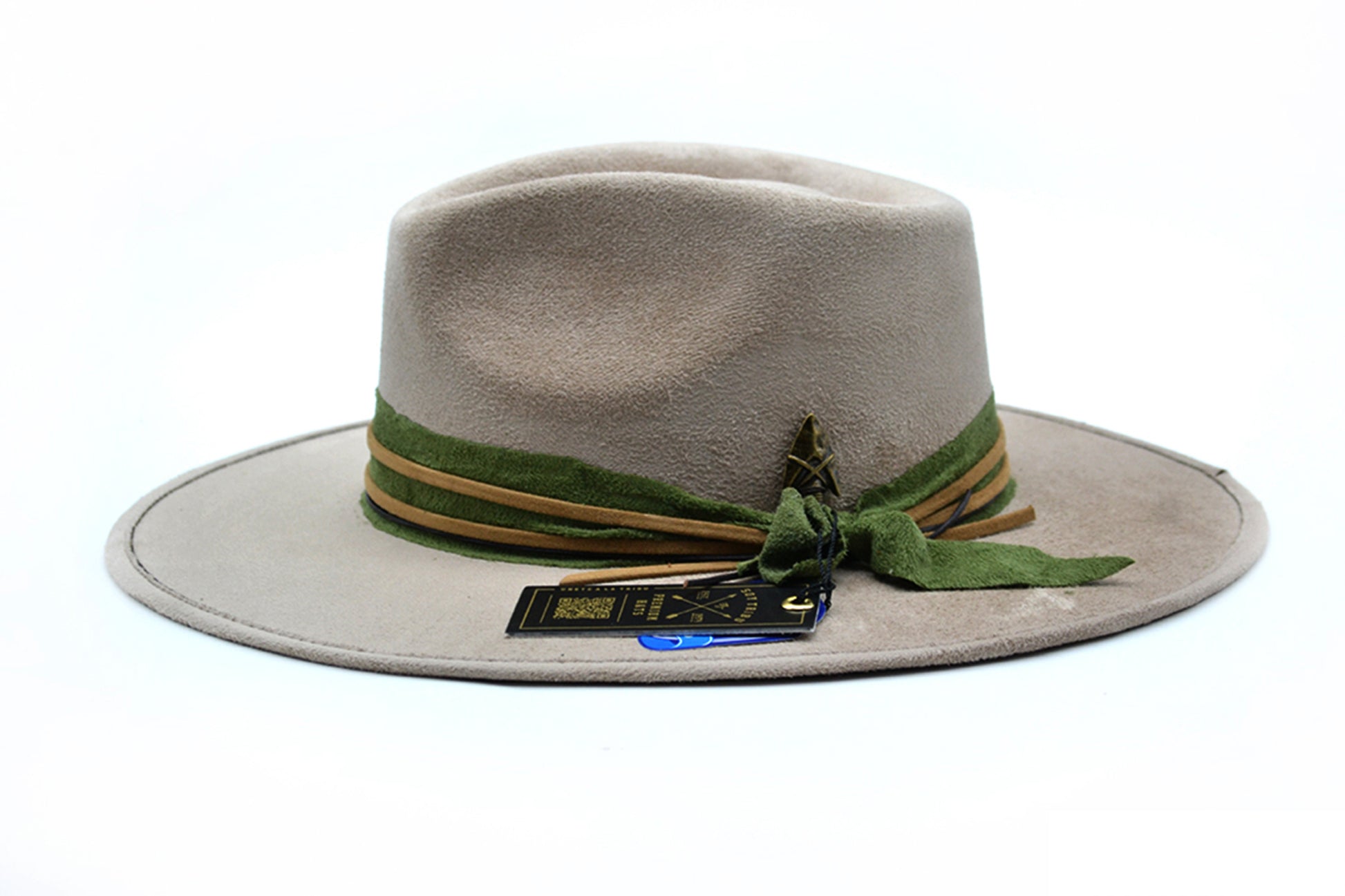 Sombrero de gamuza textil hecho a mano con detalles únicos.