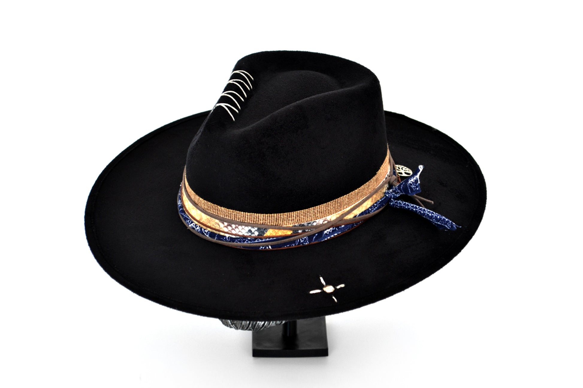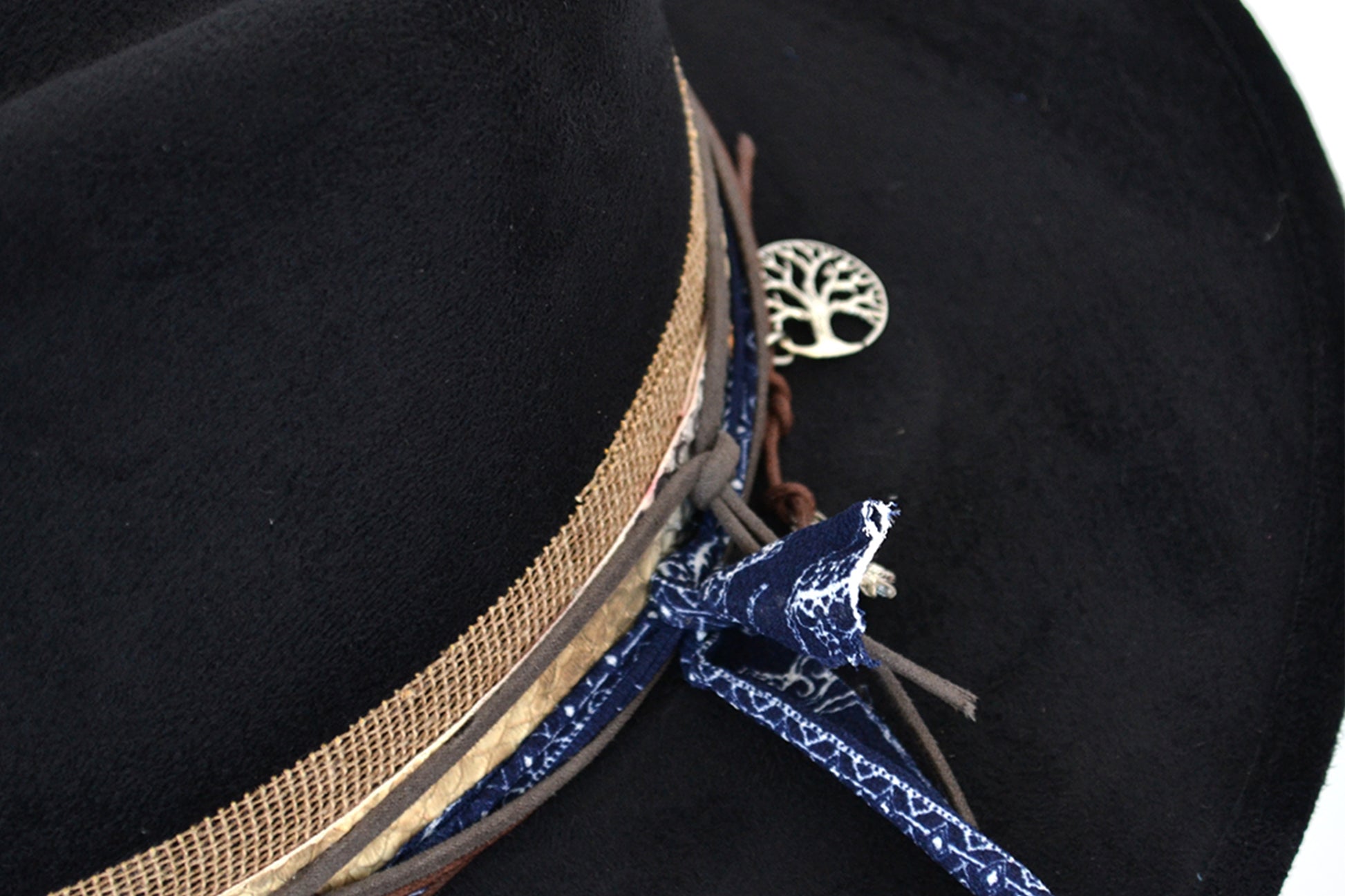 Sombrero de gamuza textil hecho a mano con detalles únicos.