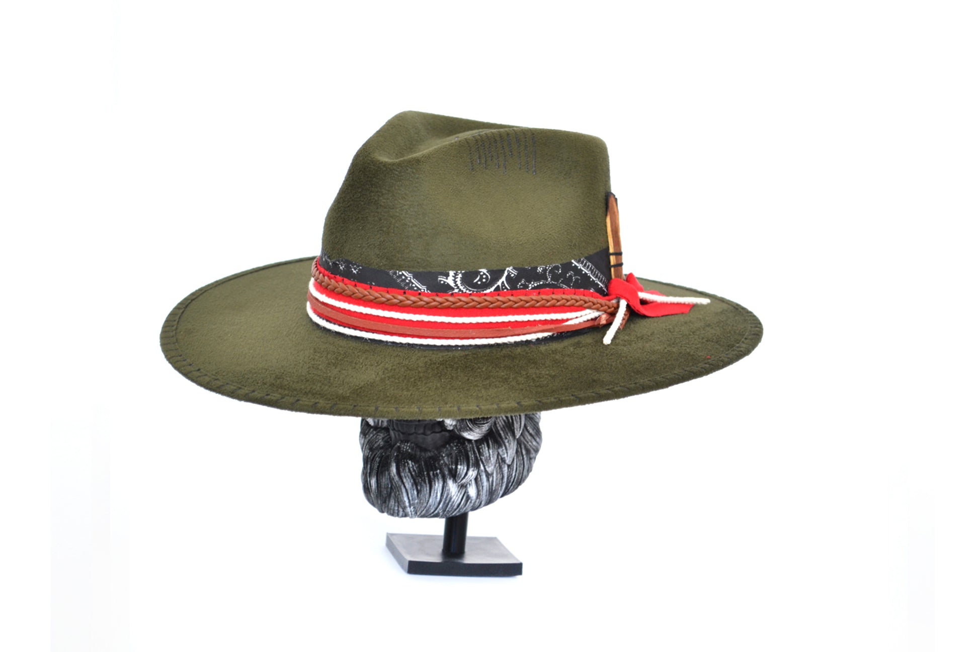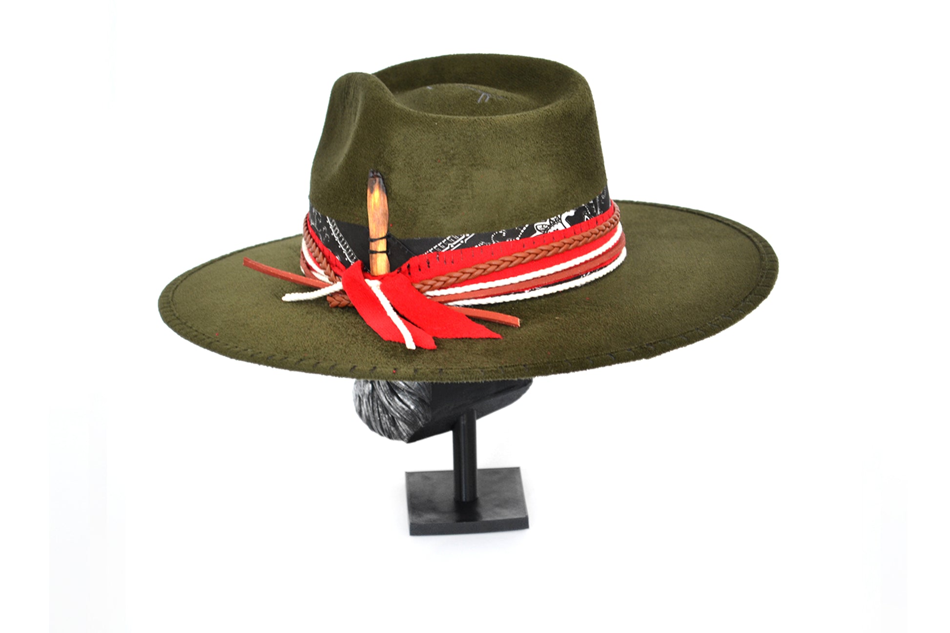 Sombrero de gamuza textil hecho a mano con detalles únicos.